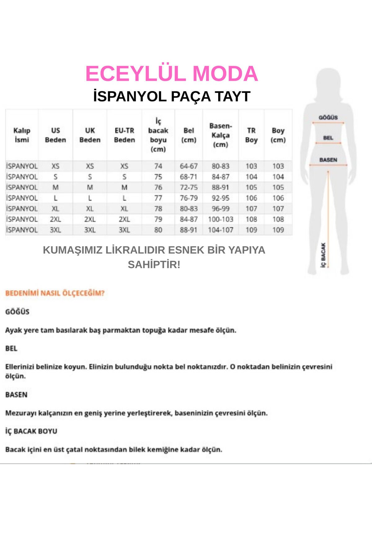 - Her mevsim rahatlıkla tercih edebileceğiniz, tüm sezonlara uygun tasarımıyla dikkat çeker.; - Tekli paket içeriği sayesinde kolayca kullanabilir ve pratik bir şekilde saklayabilirsiniz.; - Sade ve şık görünümüyle her türlü üst giyimle kombinlenebilen düz kesimi vardır.; - Gizli cep detayı ile hem fonksiyonel hem de estetik bir dokunuş sunar.; - Basic silueti sayesinde günlük kullanım için idealdir; rahatlığı ve konforu ön planda tutar.; - Lastikli bel yapısı ile mükemmel oturuş sağlar ve gün boyu konforlu hissetmenizi garanti eder.; - %85 polyester, %10 pamuk ve %5 likra karışımından oluşan materyali esneklik ve dayanıklılık sunarken vücut hatlarınıza mükemmel uyum sağlar.; - Casual koleksiyonun parçası olarak günlük stilinize modern bir hava katar.; - Tüylenme yapmayan yapısıyla uzun süreli kullanım vaad ederken, süprem dokuma tipi yumuşak dokusuyla öne çıkar.; - Cool & comfort persona'ya hitap ederek hem şıklığı hem de rahatlığı bir arada yaşamanız için tasarlanmıştır.; - Kutusuz ambalaj seçeneğiyle minimalist bir yaklaşımı benimserken aynı zamanda çevre dostu olmayı da ihmal etmez.; - Yıkama talimatlarına uyarak ürününüzü ilk günkü gibi koruyabilirsiniz; böylece uzun süreli kullanım imkanına sahip olursunuz.; - Yetişkinler için özel olarak üretilmiş bu tayt, her yaş grubundaki kadınların gardrobunda yerini alacak şekilde dizayn edilmiştir.; - Uzun boyu sayesinde bacakları olduğundan daha uzun gösterirken zarif bir duruş sergiler.; - Kadın ve kız kullanıcılar için ideal olan bu tayt, herkes tarafından rahatlıkla tercih edilebilir.; - Örme kumaşı esnekliği arttırarak hareket özgürlüğünüzü maksimize ederken dayanıklılığından ödün vermez.; - Yüksek bel tasarımı sayesinde karın bölgesini sıkılaştırırken feminen çizgilere vurgu yapar.; - İspanyol paça detayı modern ve trend bir görünüm kazandırarak farklı stillerde kombinlenebilirlik sunar.; - Casual/günlük ortamlarda rahatlıkla giyilebilecek bu tayt, günlük aktivitelerinizde size eşlik edecek ideal seçim olacaktır.