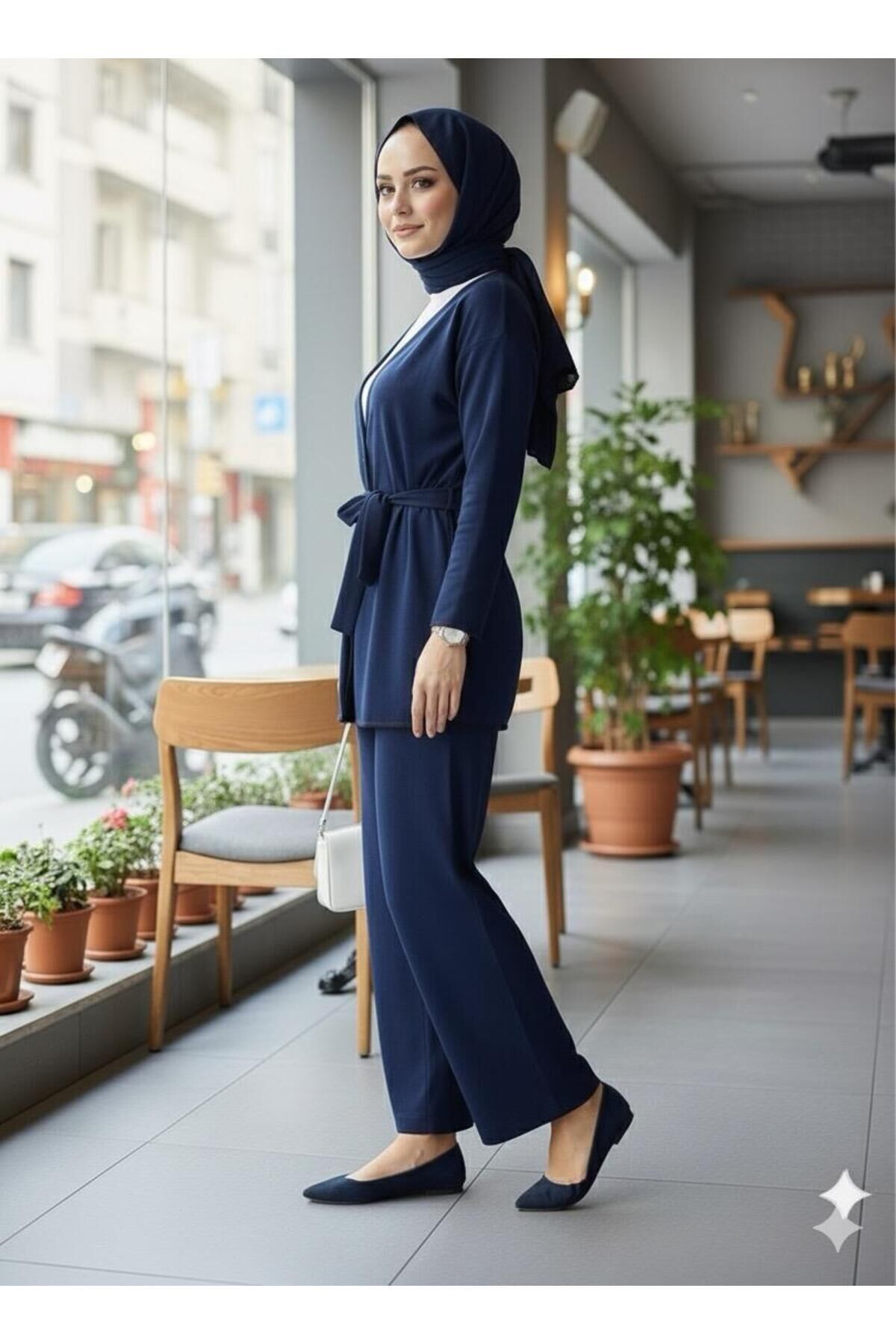 Tesettür İkili Takım Beli Bağlamalı Kimona Ve Bol Paça Pantolon Siyah Günlük Şık İkili Takım